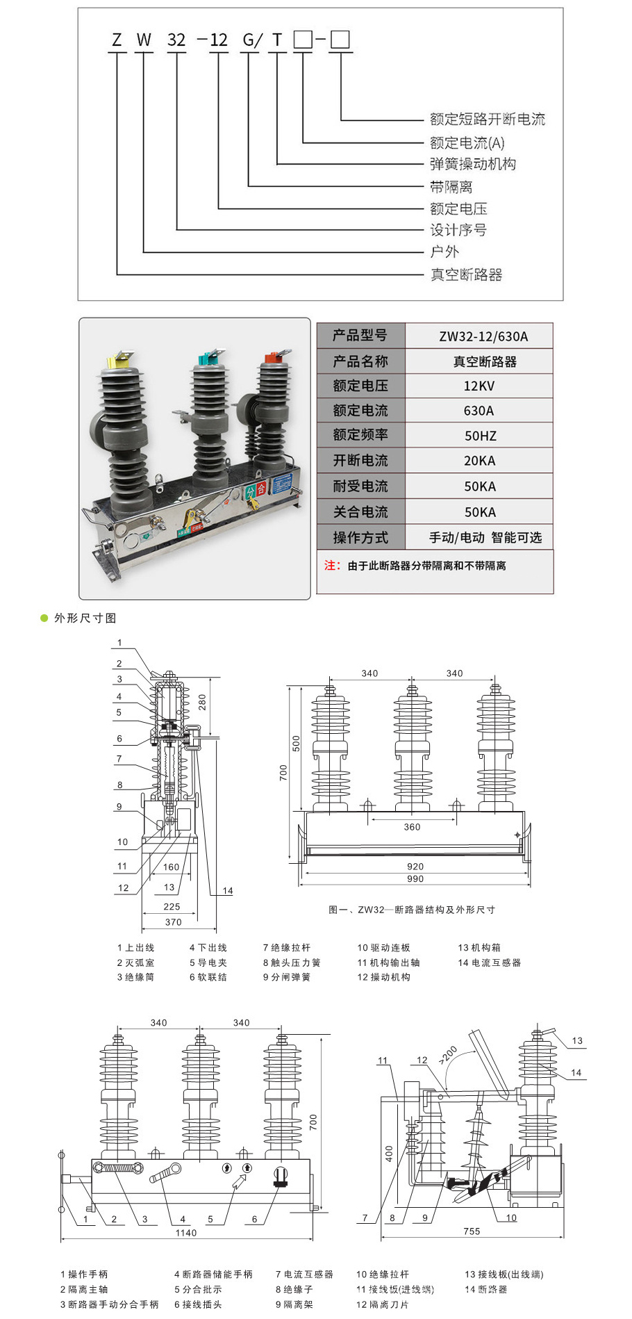 ZW32-12G不锈钢真空断路器(带隔离刀闸)