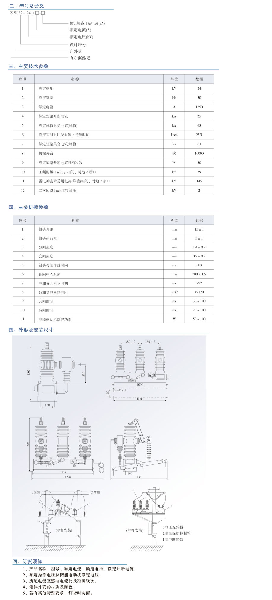 ZW口-24(27kV户外交流高压真空断路器(以F简称断路器是额定电压为24kV, 50Hz三相交流的户外配电设备。主要用于配电网开断、关合电力系统中的负荷电流、过载电流及短路电流。适用于变电站及工矿企业配电系统中作?;ず涂刂浦?,更适用于农村电网及频繁操作的场所。