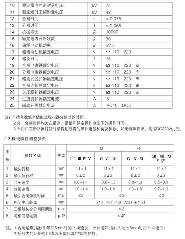 8每相回路电阻 Ω≤30(40)注:合闸速度指触头最后6mm时的平均速度.