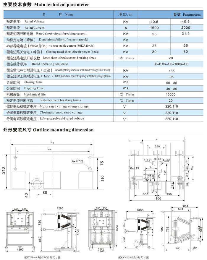 4. 试验参数提高,开断电流31.5kA的断路器,其额定短路关合电流和额定峰值耐受电流达100kA,开断电流40kA的断路器,其额定短路关合电流和额定峰值耐受电流达130kA,另外其非对称开断的直流分量为45%