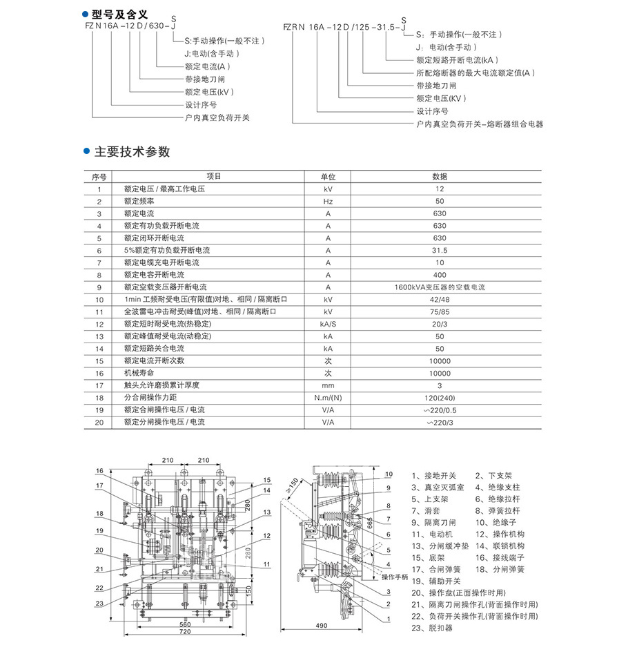 FZN16A- 12D/630型户内交流高压真空负荷开关及FZN16A- 12RD/200- 31.5型负荷开关-熔断器组合电器性能达到GB3804-90<3~63kV交流高压负荷开关>和IEC420<交流高压负荷开关-熔断器组合电器>(1990年版)国际标准及国家标准(报批稿)的要求。具有体积小、外形美观、安装灵活、操作力小、开断安全可靠、电寿命长、可频繁每操作、开断转移电流大、基本不需要维护,有明显的隔离断口且具有手、电动二用功能,可实现远距离控制等优点。负荷开关-熔断器组合电器还具有?;け溲蛊鞴兀乐股璞溉毕嘣诵械墓δ?。