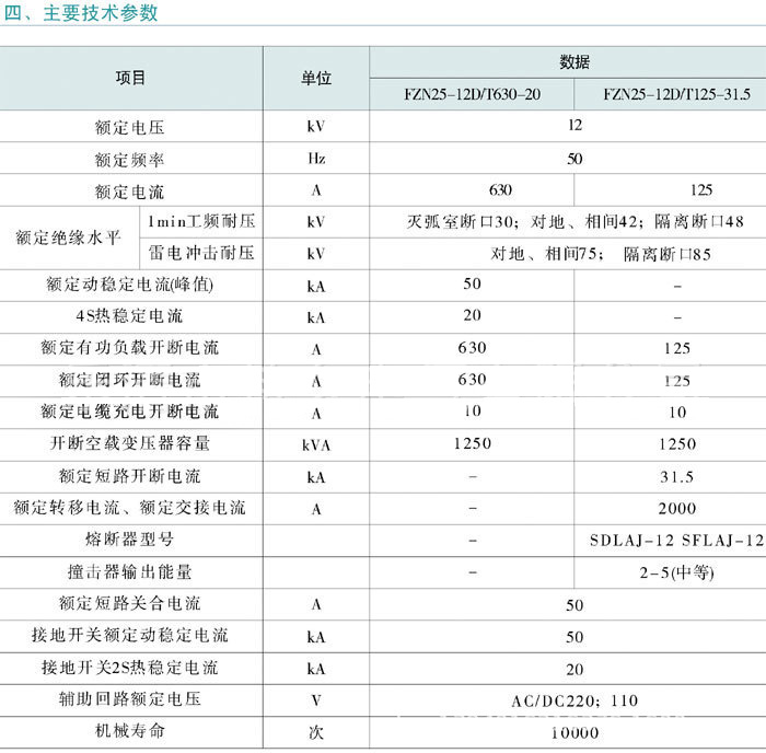 FZN25-12D/T125-31.5型交流高压真空负荷开关——熔断器组合电器是三相交流50Hz,额定电压12kV的户内装置,适用于工矿、企业、配电所及变电站等场合,作负荷控制和短路?;ぶ?。配装的接地开关,可以承受短路电流。操作机构可手动和电动,便于实现电力系统的三??匾?。