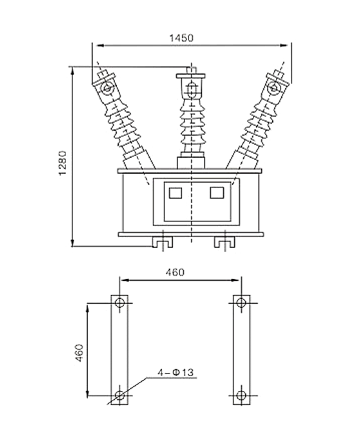 2、组合互感器由两只单相电压互感器连体成为(PT)及两只电流互感器(CT)组成,PT、CT均为电磁式,两只PT绕组采用V/V联结成三相测量装置,两只CT的一次绕组分别与电网A、C相串连。箱体侧面焊有接地螺丝。